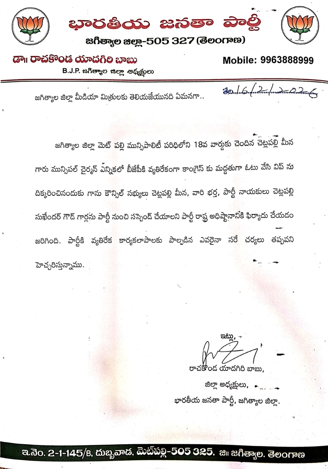 కౌన్సిలర్ ని సస్పెండ్ చేసిన బీజేపీ పార్టీ