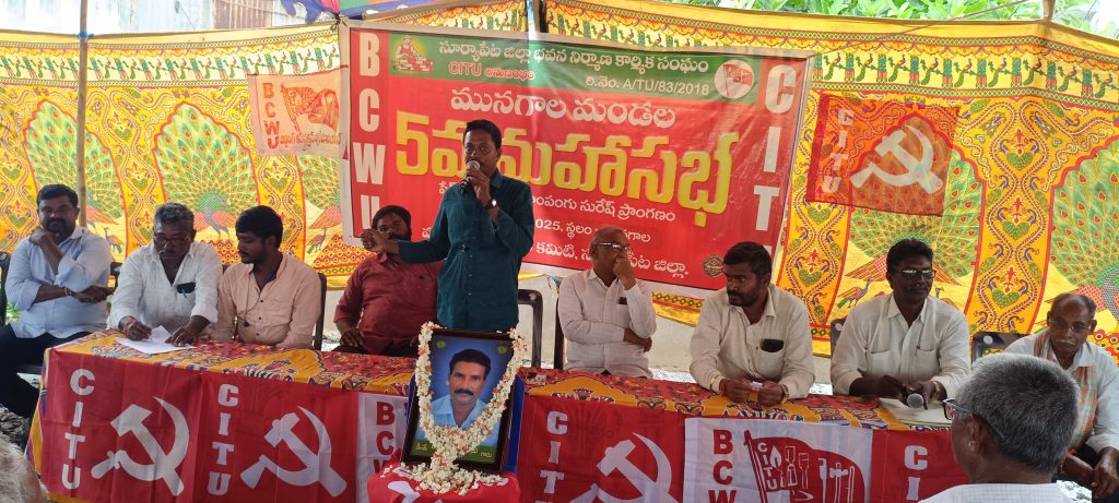 దేశ అభివృద్ధిలో కీలక భూమిక పోషిస్తున్న కార్మిక నిర్మాణ రంగాన్ని నమ్ముకుని జీవిస్తున్న కార్మికులకు సంక్షేమ బోర్డు లో పెండింగ్ క్లైమూలకు నిధులను విడుదల చేయాలని,బీసీ డబ్ల్యూ జిల్లా ప్రధాన కార్యదర్శి ఎలక సోమన్న గౌడ్ ప్రభుత్వాన్ని డిమాండ్ చేశారు.సోమవారం భవన నిర్మాణ కార్మిక సంఘం సిఐటియు అనుబంధం మునగాల మండల ఐదవ మహాసభ సభలో (బీసీ డబ్ల్యూ ) బిల్డింగ్ అదర్ కాంట్రాక్షన్ వర్కర్స్ యూనియన్ జిల్లా కార్యదర్శి ఎలక సోమన్న మాట్లాడుతూ.. భవనాల బహుళ అంతస్తులు నిర్మిస్తున్న తాపీ మేస్త్రిలు మట్టి పనివారు,రాడ్ బెండింగ్, సెంట్రింగ్,కాంక్రీట్,కార్పెంటర్స్, పెయింటర్స్,టైల్స్,మార్బుల్స్, ఎలక్ట్రిషన్,హౌస్ వెల్డింగ్ మొదలగు వృత్తంలో పనిచేస్తున్న కార్మికుల పాత్ర అమోఘమైనది.దేశాభివృద్ధిలో కీలక భూమిక పోషిస్తున్న నిర్మాణ రంగాన్ని నమ్ముకుని జీవిస్తున్న కార్మికులకు సంక్షేమ బోర్డు ఏర్పాటు కొరకు, సీఐటీయూ సహకారంతో అనేక పోరాటాలు చేసిన ఫలితంగా 1996లో భవన నిర్మాణ కార్మిక కేంద్ర చట్టం ఏర్పడిందని,దేశవ్యాప్తంగా వేల్పూరు బోర్డు సంక్షేమ పథకాలను సాధించుకోగలిగాము అని అన్నారు.లేబర్ కోడ్ లను రద్దు చెయ్యాలని భవన నిర్మాణ కార్మిక సంఘం కార్మికుల ఐక్యం చేసి నిరంతరం పోరాటం చేస్తుందన్నారు.సిఐటియు జిల్లా అధ్యక్షులు ఎం రాంబాబు మాట్లాడుతూ.. జిల్లా వ్యాప్తంగా ఉన్న పెండింగ్ క్లైమూలను తక్షణమే పరిష్కరించాలని 55 సంవత్సరాలు దాటిన కార్మికులకు 9000 రూపాయలు పెన్షన్ ఇవ్వాలని, పనిముట్లు కొనుగోలుకు ఆర్థిక సహాయం చెయ్యాలని ప్రభుత్వాన్ని కోరినారు. ఈ కార్యక్రమంలో సిఐటియు జిల్లా కమిటీ సభ్యులు బచ్చలకూర స్వరాజ్యం,షేక్ పాషా, ఎస్.కె సైదా,కోలా ఆంజనేయులు, షేక్ జాన్ పాషా, ఎస్ వీరబాబు, తదితరులు పాల్గొన్నారు. అనంతరం నూతన కమిటీ అధ్యక్షులు షేక్ దస్తగిరి, కార్యదర్శి నాగరాజు, కోశాధికారి ఎం నాగేంద్రబాబు వీరితో పాటు 25 మందిని నూతన కమిటీగా ఎన్నుకోవడం జరిగింది 9 మంది ఆఫీస్ బేరర్ ను ఏకగ్రీవంగా ఎన్నుకోవడం జరిగింది.