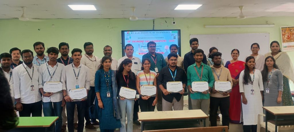 నర్సాపూర్ మున్సిపల్ పట్టణ సమీపంలోని బి.వి.రాజు ఇన్స్టిట్యూట్ ఆఫ్ టెక్నాలజీ బివిఆర్ఐటి సివిల్ ఇంజనీరింగ్ విభాగం ఆధ్వర్యంలో 58వ ఇంజనీర్ల దినోత్సవాన్ని పురస్కరించుకొని విశ్ణు నేషనల్ లెవల్ 6 అవర్స్ కాడథాన్ బిల్డ్ విజన్ 2కె25.2వ ఎడిషన్ విజయవంతంగా నిర్వహించడం జరిగిందని.కళాశాల ప్రిన్సిపల్ డాక్టర్ సంజయ్ దుబాయ్ తెలిపారు.ఈ కార్యక్రమానికి ముఖ్య అతిథులుగా ప్రుధ్వి రాజు పెన్మెట్సా పి.స్నిగ్ధ ప్రాజెక్ట్స్ కోఆర్డినేటర్ అజైల్ ఇన్ఫ్రాస్ట్రక్చర్ హాజరై విద్యార్థులను ఇంజనీరింగ్ ప్రాధాన్యత ఆవిష్కరణలపై ప్రేరేపించారు.ఈసంవత్సరం మొత్తం25 జట్లు పాల్గొనగా అందులో4జట్లుప్రతిష్ఠాత్మక కళాశాలల నుండి పాల్గొని తమ సృజనాత్మక మోడల్స్ డిజైన్ కాన్సెప్ట్లు ప్రాజెక్ట్ ఆలోచనలను ప్రదర్శించాయి.ఈ కార్యక్రమాన్ని డైరెక్టర్ డా.కె. లక్ష్మీ ప్రసాద్ ప్రిన్సిపల్ డా. సంజయ్ దూబే, కన్వీనర్ డా. ఎస్. కృష్ణరావు హెచ్ఓడి సివిల్ ఆధ్వర్యంలో ఫ్యాకల్టీ కోఆర్డినేటర్లు ఎస్.కలప్ప జె. శివరాజ్,ఎం.అభయ్ సహకారంతో విజయవంతంగా నిర్వహించారు.ఇంజనీర్ల దినోత్సవం ఉత్సాహాన్ని ప్రతిబింబించడమే కాకుండా, యువ ఇంజనీర్లకు తమ ప్రతిభను భవిష్యత్ మౌలిక సదుపాయాలు సివిల్ ఇంజనీరింగ్ దిశపై తమ దృష్టిని ప్రదర్శించేందుకు ఒక అద్భుత వేదికగా నిలిచిందని తెలిపారు.ఈ కార్యక్రమంలో కళాశాల హెచ్ హెచ్ఓడి డీన్స్ ఫాకల్టీ మెంబర్స్ కళాశాల మేనేజర్ బాపిరాజు. డాక్టర్ లక్ష్మీప్రసాద్.శ్రీనివాస్. సురేష్.మల్లికార్జున్ కాంతారావు. వివిధ విభాగాల అధ్యాపకులు విద్యార్థులు తదితరులు పాల్గొన్నారు.