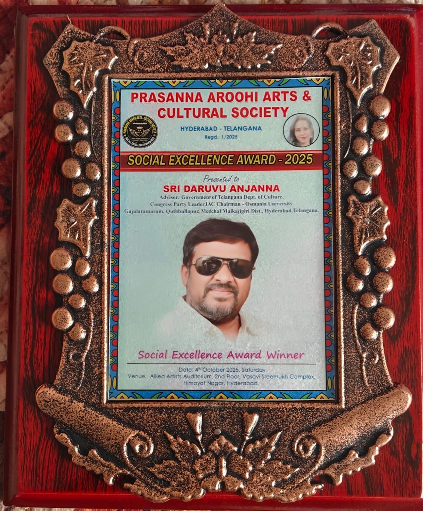 దరువు అంజన్న చేసిన సమాజ సేవకు తగిన గుర్తింపు సమాజంలో స్వార్థం ఎక్కువైంది మానవసేవే మాధవ సేవ అన్నారు పెద్దలు కానీ నేడు సమాజంలో స్వార్థం ఎక్కువైందని మనిషిని మనిషిగా గుర్తించె రోజు లేదని అయితే దరువు అంజన్న లాంటివారు తన జీవితాన్ని సమాజానికి అంకితం చేసి సమ సమాజ సేవ చేయడం హర్షించదగ్గ విషయమని ముఖ్యఅతిథిగా విచ్చేసిన సేవా రత్న అవార్డు గ్రహీత వడ్లకొండ వెంకట్రావు అన్నారు,ప్రసన్న ఆరోహి ఆర్ట్స్ అండ్ కల్చరల్ సొసైటీ వారు సమాజ సేవ చేసిన వారికి ఇచ్చే అవార్డును 2025 గాను దరువు అంజన్నను ఎంపిక చేశారు, హైదరాబాదులో జరిగిన ఒక ప్రైవేటు కార్యక్రమంలో దరువు అంజన్నకు ఈ అవార్డు అందజేశారు ఈ సందర్భంగా ప్రసన్న ఆరోహి ఆర్ట్స్ అండ్ కల్చరల్ సొసైటీ వ్యవస్థాపక అధ్యక్షురాలు ప్రసన్న ఆరోహి మాట్లాడుతూ నేటి సమాజంలో అన్నదమ్ములు అక్క చెల్లెలు సైతం ఆర్థిక సంబంధాల కూపిలో మునిగిపోయి మానవ సంబంధాలు మర్చిపోతున్నారని అందుకే మేము మా సంస్థ తరఫున సమాజ చేసిన వారికి, ఈ అవార్డు అందజేస్తామని ఈ సంవత్సరం దరువు అంజన్నను ఎంపిక చేయడం జరిగిందని ఆమె పేర్కొన్నారు.ఈ సందర్భంగా అవార్డు గ్రహీత దరువు అంజన్న మాట్లాడుతూ మానవ జన్మ ఎత్తినందుకు సమాజ సేవ చేయాలని అప్పుడే జన్మకు సార్ధకత చేకూరుతుందని ఆయన హితువు పలికారు,ఈ కార్యక్రమంలో రాష్ట్రంలోని పలు కళాకారులు పాల్గొని సంగీత కచేరి చేశారు.