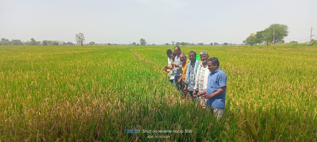 కామారెడ్డి జిల్లా బిచ్కుంద మండలంలోని బండ రెంజల్ గ్రామంలో శుక్రవారం నాడు వరి పంటలను పరిశీలించడం జరిగింది. ఈ క్షేత్ర సందర్శనలో వరిలో మాని పండు తెగులు, పొట్ట కుళ్ళు తెగులు మరియు సుడిదోమ ఉధృతిని గమనించడం జరిగింది. ఈ తెగుళ్ల నివారణకు చేపట్టవలసిన చర్యలను రైతులకు వివరించడం జరిగింది. అలాగే ప్రస్తుత వాతావరణ పరిస్థితుల్లో వరిలో ఆశిస్తున్న చీడలు మరియు తెగుళ్లు వాటి నివారణ చర్యలు రైతులకు క్రింది విధంగా వివరించడం జరిగింది.మానిపండు లేదా కాటుక తెగులు నివారణకు ప్రాపికొనజోల్ 200 మి.లీ. ఎకరానికి పిచికారి చేసుకోవాలి.పాము పొడ మరియు పొట్ట కుళ్ళు తెగుళ్ల నివారణకు ప్రాపికొనజోల్ 200 మి.లీ. ఎకరానికి లేదా హెక్సాకొనజోల్ 400 మి.లీ. ఎకరానికి పిచికారి చేసుకోవాలి.