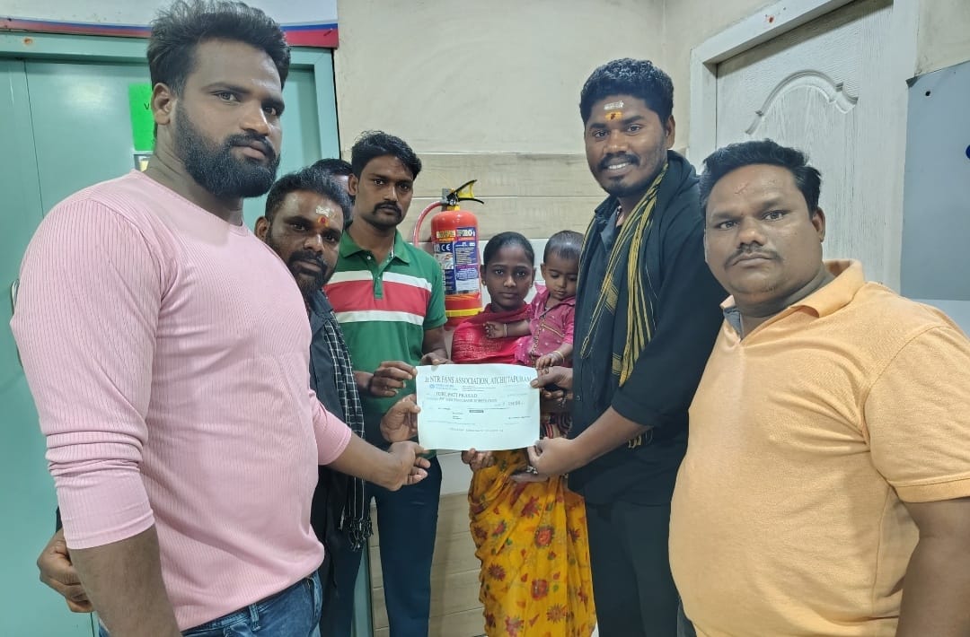 అచ్యుతాపురం మండలం చోడపల్లి గ్రామానికి చెందిన జంగాల కాలనీ యువకుడు టి. ప్రసాద్ వారం రోజుల క్రితం జరిగిన ప్రమాదంలో తీవ్రంగా గాయపడి, ప్రస్తుతం అనకాపల్లి బెనర్జీ హాస్పిటల్లో ఐసీయూ విభాగంలో చికిత్స పొందుతున్నాడు.అచ్యుతాపురం,రాంబిల్లి మండలాల జూనియర్ ఎన్టీఆర్ ఫ్యాన్స్ అసోసియేషన్ ముందుకు వచ్చి బాధిత కుటుంబానికి ఆర్థిక సాయంగా రూ.15వేలు చెక్కును అందజేశారు.ఈ సందర్బంగా వారు మాట్లాడుతూ దాతలు ముందుకు వచ్చి సాయం అందించి పేద కుటుంబాన్ని ఆర్థికంగా ఆదుకోవాలనికోరారు.ఈ కార్యక్రమంలో అధ్యక్షులు పుర్రె రవిచంద్ర యాదవ్,ఎరిపల్లి ముత్యాలు, జాయింట్ సెక్రటరీ ఆదాడ చిన్న, క్యాషియర్ వసాది ఉదయ భాస్కర్ తదితరులు పాల్గొన్నారు.