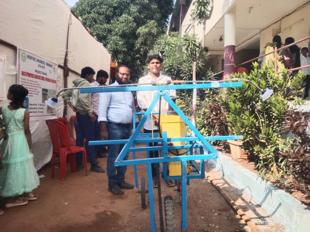 సంగారెడ్డి జిల్లా నారాయణఖేడ్ లో నిర్వహించిన సైన్స్ ఫెయిర్ సదస్సులో ఆర్ శివ చరణ్,పదవ తరగతి విద్యార్థి తనా స్వంత నైపుణ్యంతో మల్టీపర్పస్ అగ్రికల్చరల్ స్ప్రింకలర్ మాషిన్ వ్యవసాయదారులకు ఉపయోగకరమైఏ విధంగా తయారు చేయడం జరిగిందని అన్నారు.ఈ సందర్భంగా విద్యార్థి మాట్లాడుతూ వ్యవసాయం సాగు చేసే రైతన్నలు తమ పంట పొలాల్లో మొక్కలకు నీరు అందించడానికి సులభమైన పద్ధతిలో నీరు అందించడానికి మొక్కకు కావలసిన మోతాదులు నిరంబించడానికి ఈ యంత్రం పనిచేస్తుందని అన్నారు. ఈ యంత్రాన్ని ఉపయోగించడంతో రైతులకు ఎటువంటి వైపులు,స్పిన్క్లర్లు, అవసరం లేదని అన్నారు.ఈ యంత్రంతో నీటిని ఆదా చేయడంతో పాటు,తక్కువ వ్యయంతో పంటను సంరక్షించుకోవచ్చని అన్నారు.ఈ యంత్రంతోనే పంటకు మందు స్ప్రే చేసుకోవచ్చు అని అన్నారు.ఈ పరికరం తయారు చేయడానికి 5000 రూపాయలు మాత్రమే పెట్టుబడి పెట్టడం జరిగిందని అన్నారు.ఈ యంత్రం మన పంట పొలాలకు మందు సంచులు, పంట పొలం నుంచి ధాన్యపు సంచులు, పశుగ్రాసము, తీసుకురావడానికి ఉపయోగకరంగా ఉంటుందని అన్నారు.