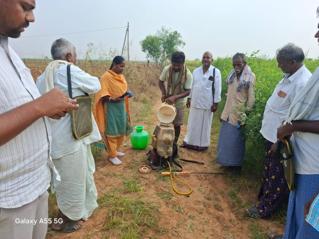 తర్లుపాడు మండలం చెన్నారెడ్డిపల్లి గ్రామంలో కంది పంటపై మండల వ్యవసాయ అధికారి పి జోష్ణ దేవి పొలంబడి కార్యక్రమం నిర్వహించారు. ప్రస్తుతం కంది పంటలో మొగ్గదశ మరియు పూత దశలోకి ప్రవేశిస్తున్నందున రైతులు తప్పనిసరిగా పురుగు గుడ్డును నివారించుకోవడానికి వేపనూనె పిచికారి చేసుకోవాలని సూచించారు. ప్రకృతి వ్యవసాయ సిబ్బంది ద్వారా తయారు చేయబడిన వేప కషాయాన్ని రైతులకు అందించారు. పొలంబడి కంది పంట క్షేత్రంలో వేప కషాయం పిచికారి చేసి రైతులకు చూపించారు. కంది పంటలో మారుకా మచ్చల పురుగు ఎక్కువగా ఆశించి మొగ్గలో గుడ్లు పెడుతుండడం రైతులకు చూపించారు. ఈ గుడ్లు పిల్ల పురుగులు గా అభివృద్ధి చెంది ఆకులను మొగ్గలను కలిపి గూడుగా ఏర్పాటు చేసుకొని పురుగు జీవితచక్రాన్ని పూర్తి చేసుకుంటాయని తద్వారా కంది పంటకు అధిక నష్టమే కలుగజేస్తాయని తెలియజేశారు. మారుకా మచ్చల పురుగు నివారణకు 20% ఈసీ క్లోరోపైర్ఫాస్ లేదా ఎసిఫేట్ పురుగుమందులను వేప కషాయంతో కలిపి పిచ్చకారి చేసుకోవాలని తెలియజేశారు. పొలంబడి కార్యక్రమంలో ఏఈఓ దేవేంద్ర గౌడ్, గ్రామ వ్యవసాయ సహాయకులు అరవింద్, వెంకటేశ్వర్ రెడ్డి ,చెన్నారెడ్డిపల్లి గ్రామ రైతులు పాల్గొన్నారు.