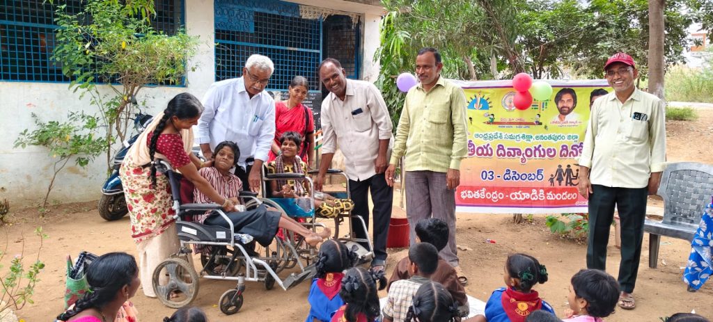 యాడికియాడికి మండలం లోని నెంబర్ 4 ప్రాథమిక పాఠశాల ఆవరణ ము లోని భవిత కేంద్రం నందు అంతర్జాతీయ దివ్యాంగుల దినోత్సవం గణంగా జరిపారు. ఈ కార్యక్రమంలో ముఖ్య అతిథిగా హాజరు ఐన మండల విద్యాధికారి కాసప్ప మాట్లాడుతూ సమాజం లో విభిన్న ప్రతిభావంతులు వారి వారికి ఇష్టమైన రంగాలలో ఇప్పుడు రాణిస్తూ, తమ కాళ్ళ పైన వారు నిలబడి తల్లిదండ్రులకు చేయూత నిస్తున్నారు. కావున వికలాంగుల పిల్లల పేర్లు ను తప్పకుండా భవిత సెంటర్ నమోదు చేయాలని చెప్పారు. పిల్లల కు ప్రభుత్వం ద్వారా తగిన అలవెన్సులు వస్తాయి.యాడికి హైస్కూల్ ప్రధానోపాధ్యాయులు సీతారామాంజనేయులు మాట్లాడుతూ భవిత కేంద్రం లోని మానసిక వికలాంగుల పిల్లల కు వారి అవసరాలకు అనుగుణంగా సాధారణ విద్యార్థులు వారికి అవసరం ఉన్నప్పుడు సహాయం చేయాలని తెలిపారు. ఈ సందర్భంగా పిల్లల చేత కేకు కట్ చేపించి, పిల్లల అందరికీ బహుమతి అందచేయడం జరిగింది.ఈ కార్యక్రమంలో మండల విద్యాధికారి కాసప్ప, హైస్కూల్ ప్రధానోపాధ్యాయులు సీతారామాంజనేయులు, వికళాంగులఉపాద్యాయులు రంగస్వామి రెడ్డి,, ఇంతియాజ్ , నాగలక్ష్మి,, చంద్రశేఖర్, రవీంద్ర, శైలజకుమారి, వరలక్ష్మి, పద్మావతి, తల్లిదండ్రులు తదితరులు పాల్గొన్నారు