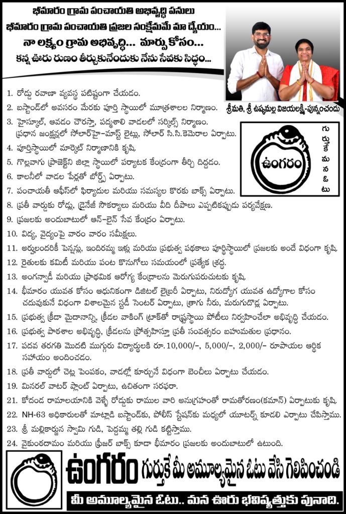 భీమారం గ్రామ సర్పంచ్ అభ్యర్థి ఉష్కమల్ల విజయలక్ష్మి పున్నం చందు ఎన్నికల ప్రచారంలో దూసుకుపోతున్నారు.గ్రామం లో వాడ వాడలా ఇంటింటికి ప్రచారం నిర్వహిస్తున్నారు. ఉంగరం గుర్తుకు ఓటు వేసి తనని గెలిపించాలని ప్రచారం నిర్వహిస్తున్నారు. తనకు ఒక్కసారి అవకాశం కల్పిస్తే గ్రామాన్ని అభివృద్ధి బాటలో ఉంచుతానన తెలిపారు. గ్రామంలో దశలవారీగా అభివృద్ధి పనులను చేపడతానని ప్రజలకు హామీ ఇస్తున్నారు. గ్రామంలో చేపట్టే అభివృద్ధి పనుల మేనిఫెస్టో ను ప్రజలకు వివరిస్తున్నారు.