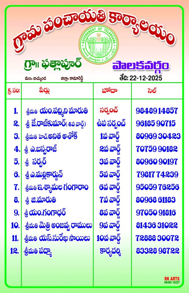 కామారెడ్డి జిల్లా జుక్కల్ నియోజకవర్గం బిచ్కుంద మండలం పత్తలాపూర్ గ్రామ సర్పంచ్ ఉప సర్పంచ్ వార్డ్ సభ్యులను పత్లపూర్ హెడ్మాస్టర్ ఇర్షాద్ ప్రమాణ స్వీకారం చేయించారు ఈ సందర్భంగా హెడ్మాస్టర్ ఈర్షద్ మొదట సర్పంచ్ గా ఎం పద్మిని మారుతి ఉప సర్పంచ్ జె రాజ్ కుమార్ గా మరియు వార్డ్ సభ్యులను ప్రమాణస్వీకారం చేయించారు,అనంతరం పంచాయతీ కార్యాలయంలో సర్పంచ్ ఎం పద్మిని మారుతి ,ఉప సర్పంచ్ జె రాజ్ కుమార్ వార్డ్ సభ్యులు అనిత అశోక్ , ఏ బసవరాజ్ , సర్వర్ మల్లికార్జున్ , ఈ శ్యామల గంగారం, మారుతి ఎం గంగాధర్ . అంజవ్వ రాములు , సురేఖ సాయిలు , గ్రామ పెద్దలు మాజీ మార్కెట్ కమిటీ చైర్మన్ నాగనాథ్ పటేల్, సిద్ధప్ప పటేల్ రాజు పాల్గొన్నారు నూతన సర్పంచ్ ని పంచాయతీ సెక్రెటరీ శాలువాతో సన్మానించారు ఈ సందర్భంగా నూతనంగా ఎన్నికైన సర్పంచ్ పద్మిని మారుతి మాట్లాడుతూ ఎమ్మెల్యే తోట లక్ష్మీకాంతరావు అండ గ్రామ పెద్దల ప్రజల సహకారంతో గెలిపించినందుకు తనపై ఉంచిన నమ్మకాన్ని ఓమ్ము చేయకుండా అందరి సహకారంతో గ్రామ అభివృద్ధి చేస్తా నని అన్నారు.