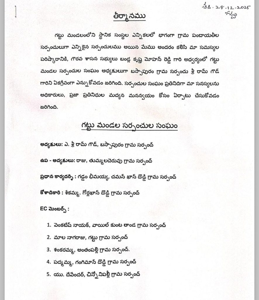 2.మాల నాగరాజు గట్టు గ్రామ సర్పంచ్. 3.శంకరమ్మ అంతంపల్లి గ్రామ సర్పంచ్ 4.పద్మమ్మ గంగిమాన్ దొడ్డి గ్రామ సర్పంచ్ 5.ఎం దేవేందర్ చిన్నోని పల్లి గ్రామ సర్పంచ్ వీరందరూ ఏకగ్రీవంగా గట్టు మండల సర్పంచ్లు సంఘం నూతన కార్యవర్గం గా ఎన్నిక కావడం జరిగినది. సర్పంచ్లు సంఘం అధ్యక్షుడిగా వివిధ గ్రామాలలోని సర్పంచ్లు సమస్యలను అధికారులు దృష్టికి ప్రజాప్రతినిధులు దృష్టికి తీసుకువెళ్లి గ్రామాల అభివృద్ధి కోసం నా వంతుగా కృషి చేస్తానని తెలిపారు.
