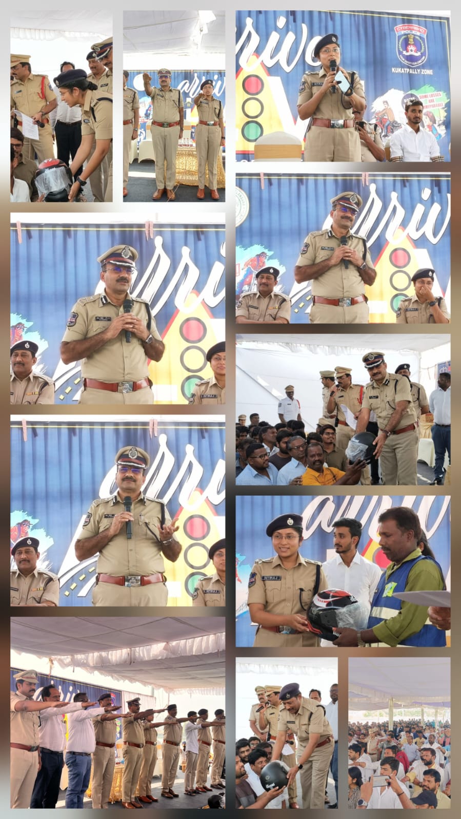 హెల్మెట్ ధరిస్తే జుట్టు రాలిపోతుందనే అపోహ కారణంగా కొందరు హెల్మెట్ ధరించకుండా ప్రయాణిస్తున్నారని, అయితే హెల్మెట్ లేకుండా ప్రయాణం ప్రాణాంతకంగా మారవచ్చని ఆయన హెచ్చరించారు. ముఖ్యంగా విద్యార్థులు, యువత ఎక్కువగా రోడ్డు ప్రమాదాలకు గురవుతున్న నేపథ్యంలో, ఇలాంటి అవగాహన కార్యక్రమాలను మరింత విస్తృతంగా నిర్వహిస్తున్నామని తెలిపారు. అనంతరం వాహనదారులకు హెల్మెట్లు పంపిణీ చేశారు.ఈ కార్యక్రమంలో కూకట్పల్లి జోన్ డీసీపీ రీతి రాజ్, మేడ్చల్ ట్రాఫిక్ డీసీపీ రంజన్ రత్నకుమార్, అదనపు డీసీపీ (ట్రాఫిక్), బాలానగర్ ఏసీపీ, జీహెచ్ఎంసీ డిప్యూటీ కమిషనర్ (మూసాపేట), మోటార్ వెహికల్ ఇన్స్పెక్టర్, ఆర్టీసీ డిపో మేనేజర్తో పాటు పలువురు పోలీసు అధికారులు, సిబ్బంది పాల్గొన్నారు.