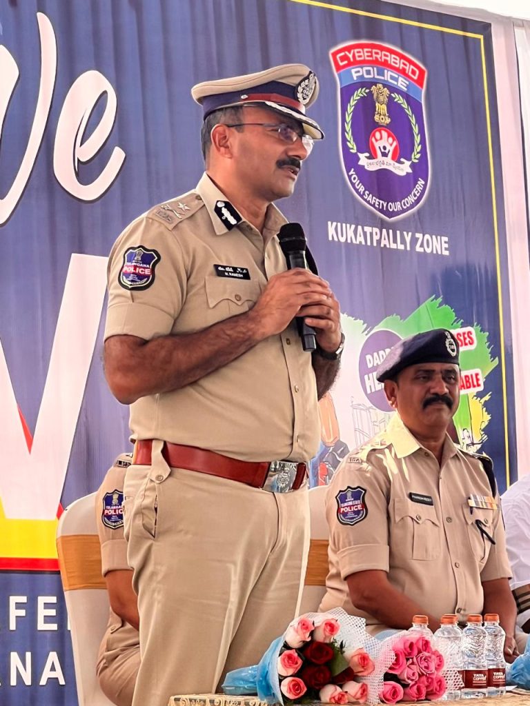 సైబరాబాద్ పోలీస్ కమిషనర్ ఆధ్వర్యంలో నేడు కూకట్పల్లి పోలీస్ స్టేషన్ పరిధిలోని ఐడీఎల్ రంగదాముని చెరువు వద్ద ‘ఆరైవ్ ఆలైవ్’ రోడ్డు భద్రతా అవగాహన కార్యక్రమం ఘనంగా నిర్వహించబడింది. ఈ కార్యక్రమానికి సైబరాబాద్ పోలీస్ కమిషనర్ ముఖ్య అతిథిగా హాజరై ప్రజలకు విలువైన సూచనలు చేశారు.