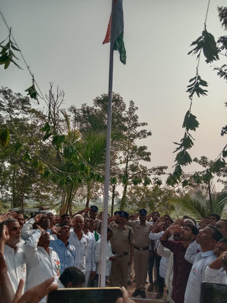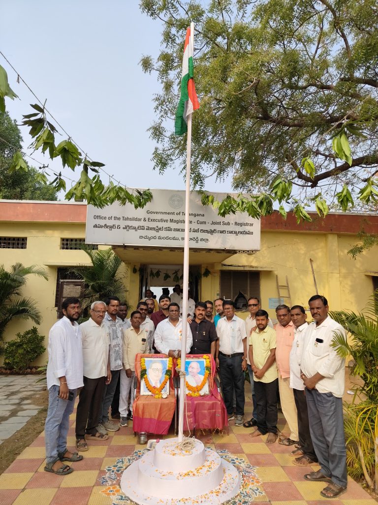 భారత గణతంత్ర దినోత్సవాన్ని పురస్కరించుకుని కామారెడ్డి జిల్లా బిచ్కుంద మండల కేంద్రంలోని తాసిల్దార్ కార్యాలయంలో 77వ గణతంత్ర దినోత్సవ వేడుకలు ఘనంగా తాసిల్దార్ వేణుగోపాల్ నిర్వహించారు. అనంతరం జాతీయ జెండాను ఆవిష్కరించి గౌరవవందనం చేశారు.ఈ కార్యక్రమంలో తాసిల్దారు తో పాటు డిటి భరత్ రెవెన్యూ ఇన్స్పెక్టర్ రవీందర్ తాసిల్దార్ కార్యాలయ సిబ్బంది పోలీస్ సిబ్బంది మండల ఎంపీడీవో గోపాలకృష్ణ ఆప్కారి సిఐ సత్యనారాయణ బిచ్కుంద మండల రిపోర్టర్స్ మరియు కాంగ్రెస్ పార్టీ మండల అధ్యక్షుడు గంగాధర్ మాజీ జెడ్పిటిసి రాజు గ్రామ ప్రజలు ప్రజా ప్రతినిధులు పాల్గొని వేడుకలను ఘనంగా నిర్వహించారు