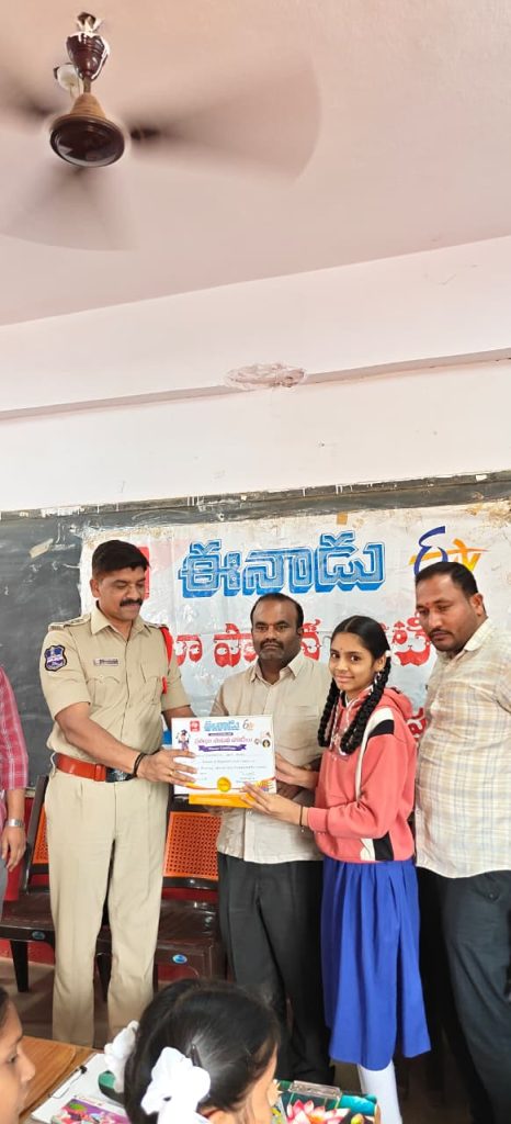 స్థాయిలో బుధవారం ఈనాడు ఆధ్వర్యంలో నిర్వహించిన ప్రతిభా పాటవ పోటీలు ఎస్సే రైటింగ్, డ్రాయింగ్ లలో విద్యా భారతి పాఠశాలకు చెందిన విద్యార్థులు N శాన్వి రెడ్డి, V సుచిత పట్టణ స్థాయిలో ప్రథమ, ద్వితీయ స్థానంలో నిలిచారని, వారికి CI గారి చేతుల మీదుగా బహుమతులు అందించారని ప్రిన్సిపాల్ టి కృష్ణారెడ్డి తెలిచేశారు