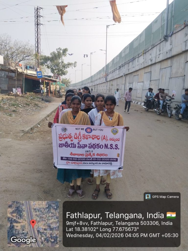 యూనిట్ 2 ఫతాలాపూర్ గ్రామంలో నేడు ప్రారంభమైంది.కళాశాల ప్రిన్సిపల్ కె.అశోక్ అధ్యక్షత వహించగా పత్లాపూర్ సర్పంచ్ పద్మిని మారుతి మరియు ఉపసర్పంచ్ రాజ్ కుమార్ మాజి మార్కెట్ కమిటీ చైర్మన్ నాగనాథ్ పటేల్ ముఖ్య అతిథిగా హాజరైనారు.ఈ సందర్బంగా ప్రారంభోత్సవ కార్యక్రమంలో ప్రిన్సిపాల్ మాట్లాడుతూ విద్యార్థులు కళాశాల దశ నుండే సేవాభావాన్ని అలవర్చుకోవడానికి, సమాజ అధ్యయనానికి, నాయకత్వ లక్షణాలు, వ్యక్తిత్వ వికాసానికి ఎన్. ఎస్. ఎస్ ఒక చక్కని వేదిక అన్నారు. ఈ శిబిరంలో భాగంగా వాలంటీర్లు గ్రామంలో పచ్చదనం – పరిశుభ్రత, మూఢ నమ్మకాలు, అంటరానితనం, మాతా -శిశు ఆరోగ్యం, మద్యపానం, ధూమపానం వల్ల కలిగే అనర్ధాలు, బాలకార్మిక వ్యవస్థ నిషేధం, ఆర్థిక అక్షరాస్యత, స్వయం సహాయక సంఘాల ఆవశ్య కత, వయోజన విద్య,స్కూల్ డ్రాప్ అవుట్స్ వంటి అంశాలపై వాలంటీర్లు వారం రోజుల ప్రజలకు అవగాహన కల్పిస్తారన్నారు. తమ గ్రామాన్ని ఎన్నుకోవడం ఎంతో సంతోష దాయకమని, శిబిరానికి తమ వంతు సహాయ సహకారమందిస్తామని గ్రామ సర్పంచ్ లు తెలిపారు. ఈ కార్యక్రమంలో గ్రామ పెద్దలు , యువకులు, పాఠశాల ప్రధానోపాధ్యాయులు ఎన్. ఎస్. ఎస్ ప్రోగ్రాం అధికారులు డా. వై. సంజీవరెడ్డి మరియు ఎ. రఘునాథ్ గార్లు మరియు కళాశాల అధ్యాపక,బృందం, గ్రామస్థులు మరియు ఎన్. ఎస్. ఎస్. వాలంటీర్లు పాల్గొన్నారు.