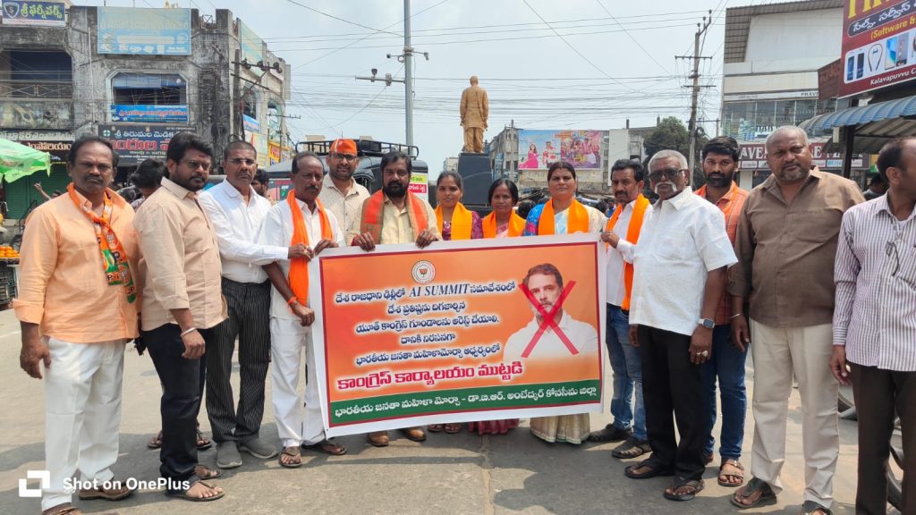 బిజెపి జిల్లా అద్యక్షులు అడబాల మండపేటలో మహిళా మోర్చ ఆద్వర్యంలో యల్లాన శకుంతల అద్యక్షతన మున్సిపల్ ఆపీస్ నుండి కపిలేశ్వరపురం రోడ్లో ర్యాలీ నిర్వహించారు ఈకార్యక్రమానికి జిల్లా అద్యక్షులు అడబాల సత్యనారాయణ, రాష్ట్ర కార్యవర్గ సబ్యులు పాలూరి సత్యానందం పాల్గొని మాట్లాడుతూ దేశరాజధాని డిల్లీలో భారత్ మండపం వేదికగా ఏఐ సమ్మిట్ సమావేశంలో రాహుల్ గాంధీ సూచనలతో యూత్ కాంగ్రెస్ నాయకులు చొక్కాలువిప్పి వీరంగం చేసినవారు పాస్ లతో వచ్చారా,క్యూఆర్ కోడ్ తో లోపలికి ప్రవేశించారా అనేది ఆరాతీసి అరెస్టు చేయాలని డిమాండ్ చేశారు.ఇన్నోవేషన్ కు పెద్దపీటవేస్తూ ప్రతిష్ఠాత్మక గ్లోబల్ ఏఐసమ్మిట్ కు భారత్ ఆతిధ్యం ఇస్తుంటే కాంగ్రెస్ పార్టీ అప్రతిష్ఠపాలు చేయాలను కోవడం దేశప్రయోజనాలకు భంగకరమని అన్నారు.ఇటువంటి అంతర్జాతీయంగా దేశప్రతిష్ఠను దెబ్బతీయడం తగదని వార్ని క్షమించరాదని అన్నారు.ఈకార్యక్రమంలో మైనార్టీమోర్చ జిల్లా అద్యక్షులు సాదిక్,సీనియర్ నాయకులు కోనసత్యనారాయణ, జిల్లా ఉపాద్యక్షులు చాట్రాతి రాంబాబు,కోటిపల్లి సాయిరాం,ఐటిసెల్ కన్వీనర్ చుండ్రు సాయిరాం బార్గవ్,,కోటిపల్లి శ్రావణి, మద్దుల రేణుకాదేవి,మండపేట పట్టణ అద్యక్షులు నాళం పణిప్రకాష్, మద్దులసుబ్బారావు,కోటిపల్లి క్రిష్ణ,గురజాపు శ్రీనువాస్,నీలచిన్న కార్యకర్తలు పాల్గొన్నారు.