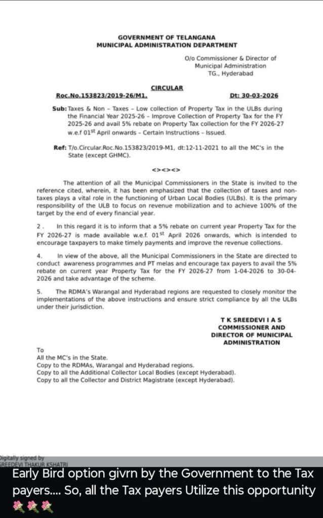 Listen to this article ఏప్రిల్ 4,2026 జనం న్యూస్ ఏప్రిల్ 30 లోపు అస్తి పన్ను చెల్లించి 5% రాయితీ కల్పించబడుతుంది. కావున పట్టణ ప్రజలు ఈ అవకాశంను సద్వినియోగం చేసుకొని ఆస్తి పన్నులు చెల్లించి పట్టనాబివృద్ధికి సహకరించగలరు.ఇట్లు, మున్సిపల్ కమిషనర్ మున్సిపాలీటి, జహీరాబాద్