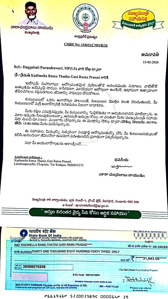 రాజంపేట మండలం ములక్కా యలపల్లె గ్రామానికి చెందిన కడిమెళ్ళ రామ తాత గారి రామ ప్రసాద్ కు రూ 31,843 మంజూ రైన సీఎం సహాయనిది చెక్కును భాజపా జిల్లా అధ్యక్షుడు సాయి లోకేష్ బుధవారం వారి గ్రామా నికి వెళ్లి చెక్కును అందజేశారు ఈసందర్భం గా సాయి లోకేశ్ మాట్లా డుతూ సీఎం సహాయ నిది మిమ్మల్ని సత్వరంగా సంపూర్ణంగా ఆరోగ్యవంతు లని చేసి మీ కుటుంబ సభ్యులతో కలిసి ఆనందంగా జీవించేలా ఉపయోగపడుతుందని ఆయన తెలిపారు. పేదల సంక్షేమానికి కూటమి ప్రభుత్వం ఎల్లప్పుడూ అండగా ఉంటుందన్నారు. ఈ కార్యక్రమంలో బిజెపి రాష్ట్ర ప్రధాన కార్యదర్శి నాగోతు రమేష్ నాయుడు, మరియు సీనియర్ నాయ కుడు వై సురేష్ రాజు, జిల్లా కార్యదర్శి నరేంద్ర రాజు ,మండల రూరల్ అధ్య క్షుడు ప్రసాద్ రెడ్డి మరియు వివి రమణ, హిమగిరి యాదవ్ ఆది నారాయణ ప్రభావతమ్మ, బూత్ అధ్యక్షురాలు శంక రమ్మ ,పార్టీ నాయకులు మరియు ఇతరులు పాల్గొన్నారు