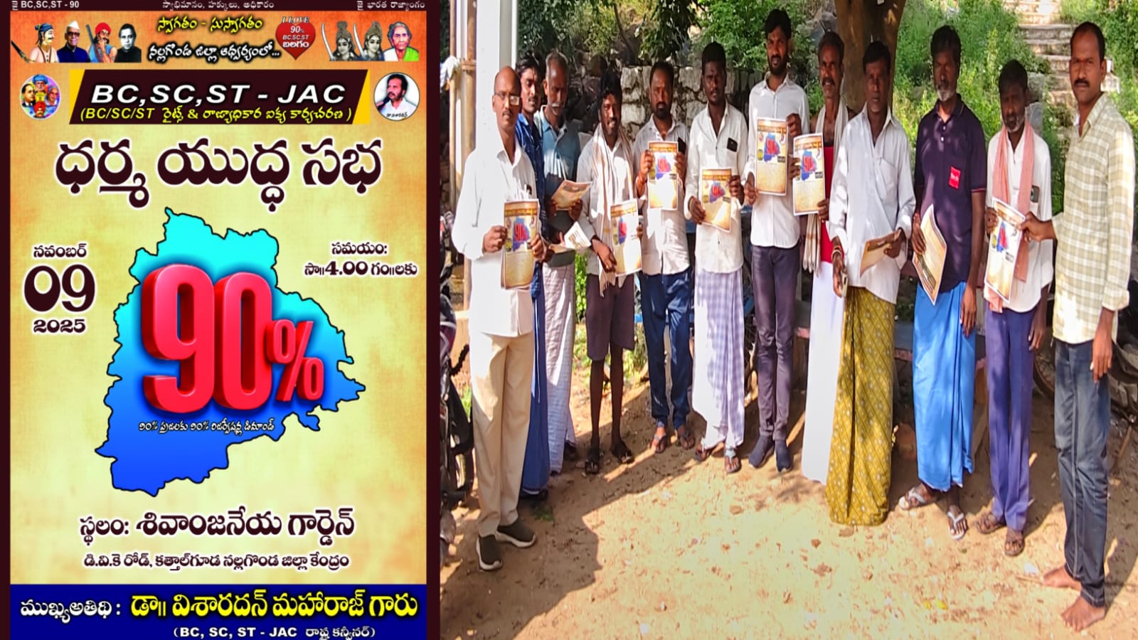 బీసీ ఎస్సీ ఎస్టీ జేఏసీ రాష్ట్ర నాయకులు బోగోజుమహేశ్వర చారి ఆధ్వర్యం లో బీసీ ఎస్సీ ఎస్టీ 90% రిజర్వేషన్ సాధన ధర్మ యుద్ధ సభ కరపత్రం ఆవిష్కరణ